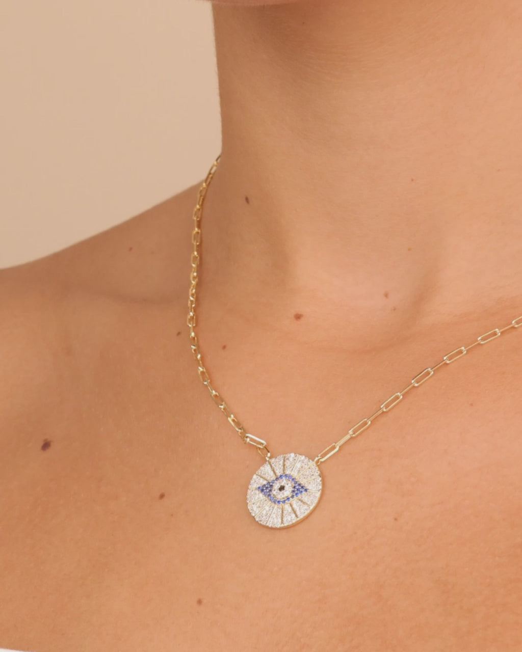 Shine bright and bold with this striking and unique evil eye pendant! This dainty disk is adorned with sparkling CZ stones. Available in gold and silver tones.