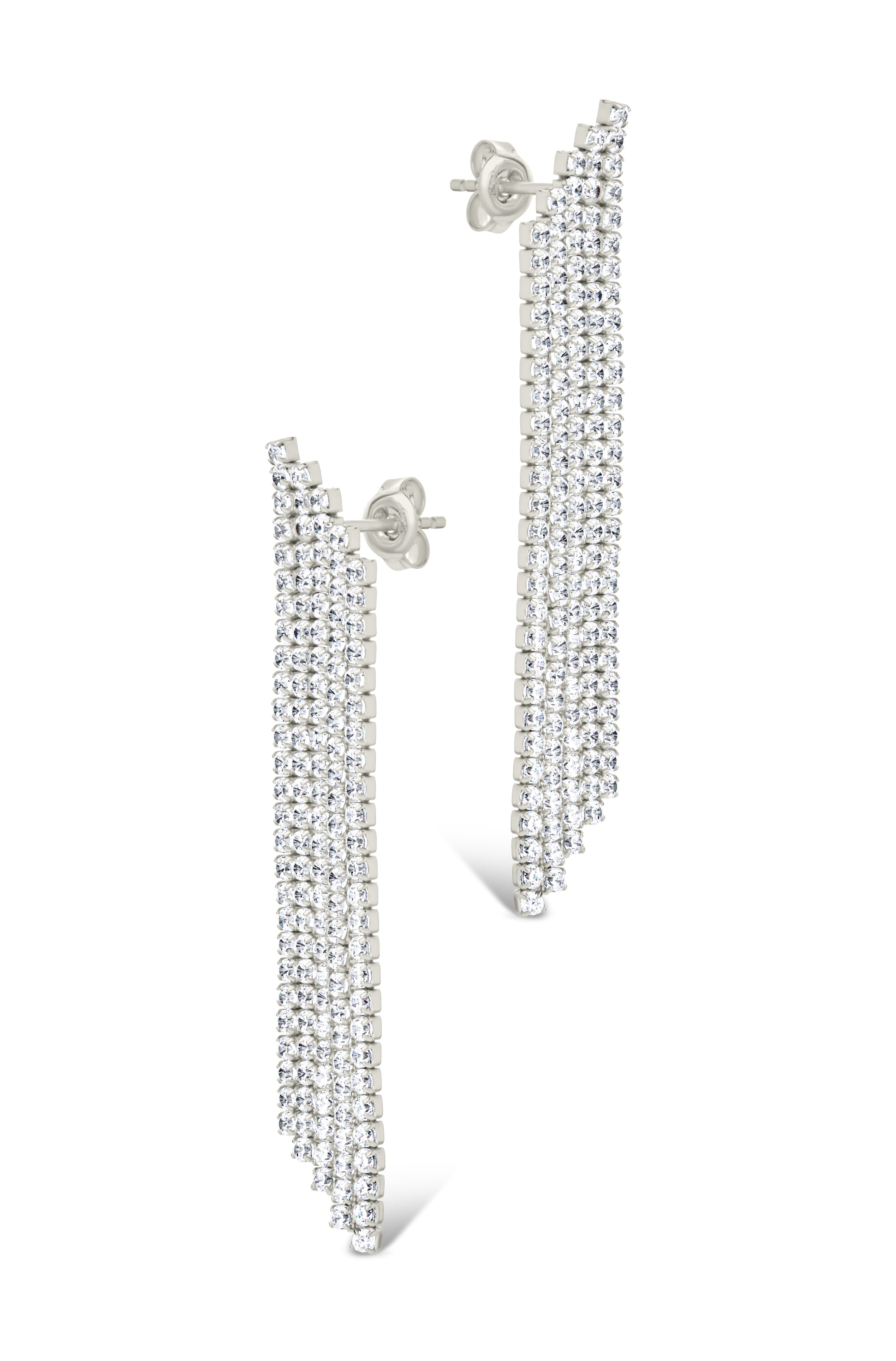 Features: Earrings is 1.75 in, with graduated waterfall dangle, 2 mm round prong set cz stones, post backing, lead and nickel free