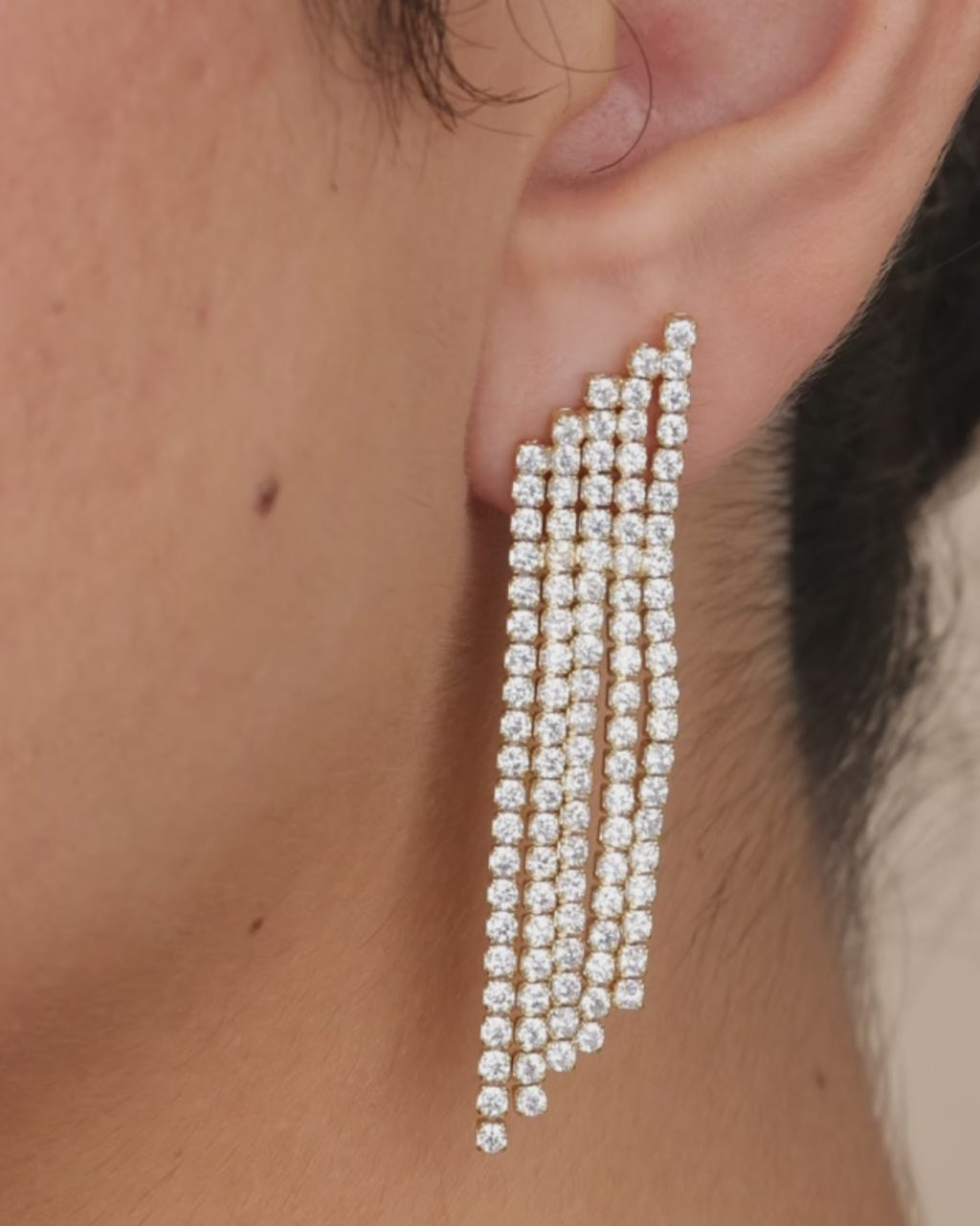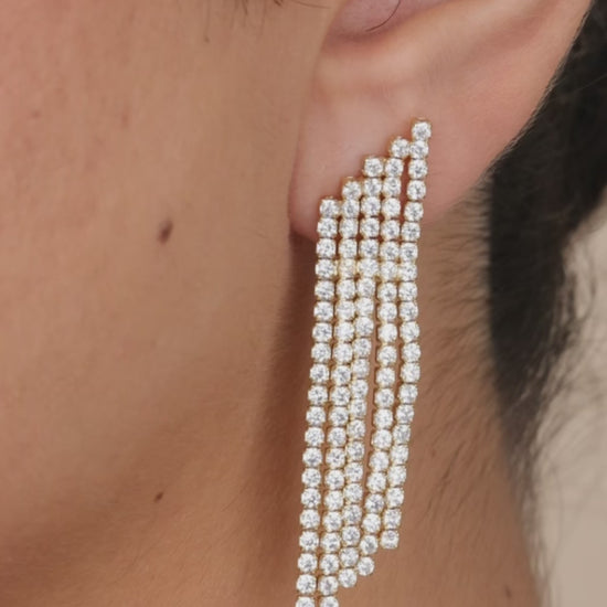 Dazzle and delight with our Clara CZ Dangle Stud Earrings. These sophisticated earrings feature five rows of sparkling CZ studs, perfect for adding a touch of luxury to any outfit. Elevate your style with this exclusive and elegant accessory.