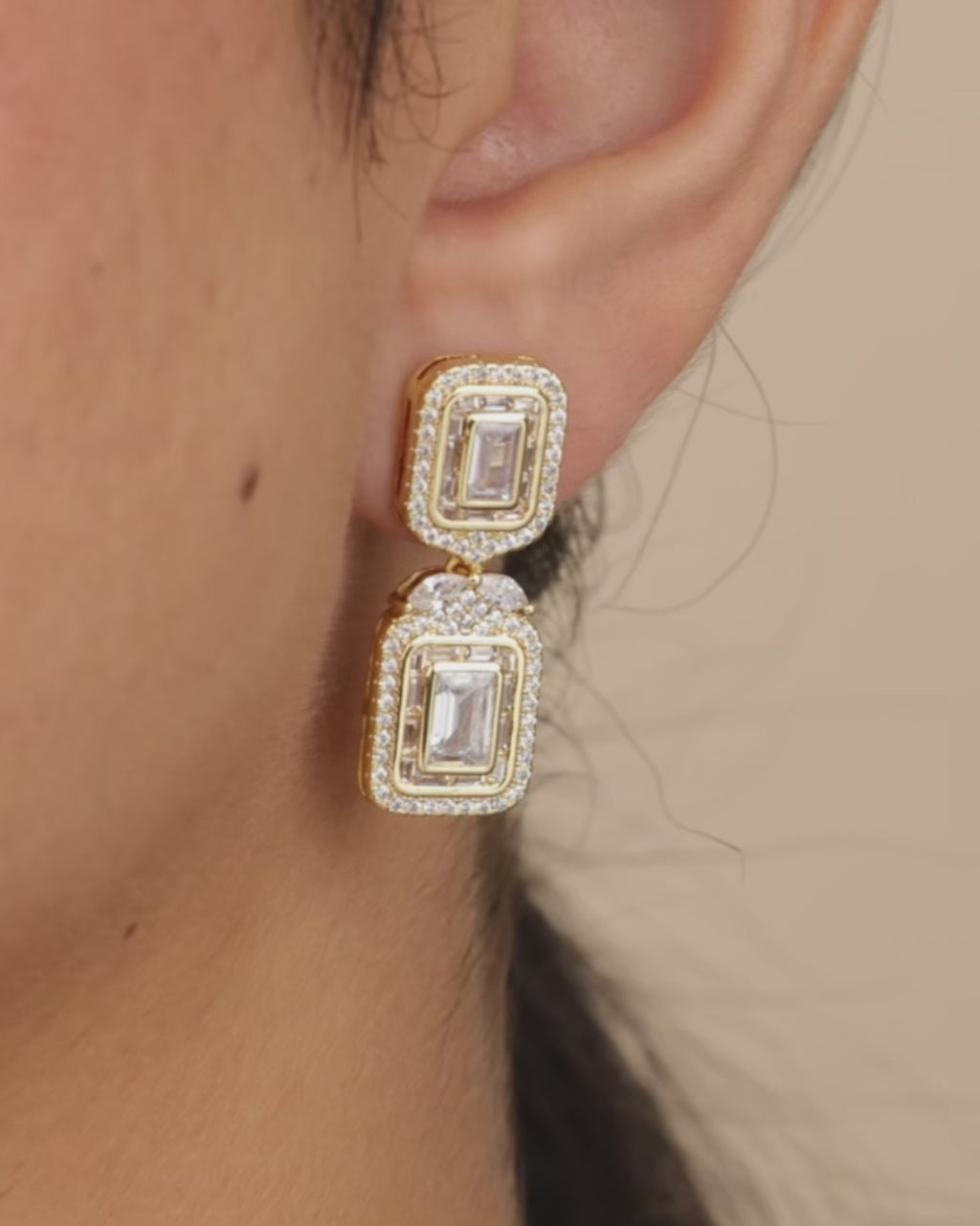 Enhance your elegance and sophistication with Trina CZ Square Drop Earrings. The eye-catching square cz drop is delicately bordered with smaller cz, offering a luxurious touch to any outfit. Elevate your style and make a statement with these exclusive earrings.