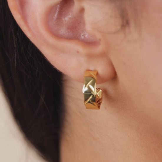 Angular and unapologetic. These textured hoops bring a sculptural edge to your stack—chunky enough to stand alone, striking enough to pair with sleek studs or a polished ear cuff.