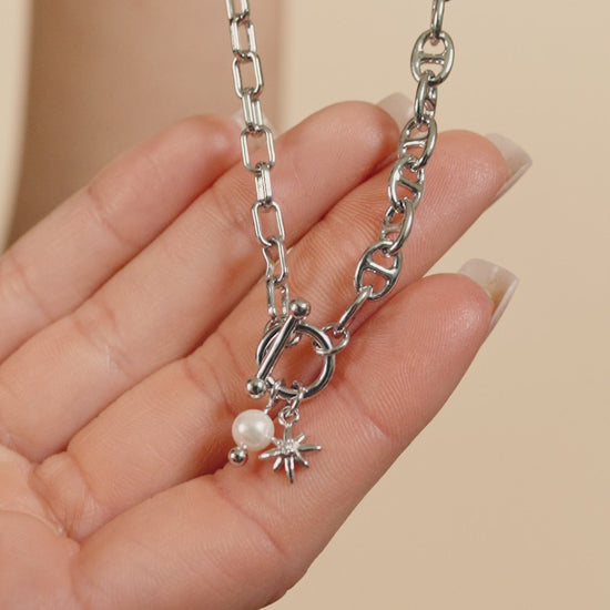 The Ava Toggle Necklace is a must-have for those who love to mix and match. This piece combines a mixed chain link with two flirty charms – a classic pearl and a sparkling cubic zirconia burst. Available in silver and gold, the toggle necklace adds serious sparkle to any outfit with one easy clasp.