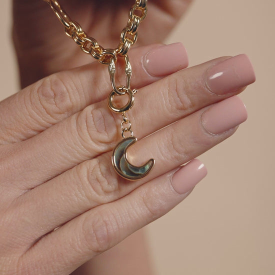 Introducing our Blue Moon Abalone Charm. Its crescent shape and colorful abalone center exude luxury and exclusivity. Elevate your style with this exquisite piece that will add a touch of elegance to any outfit.