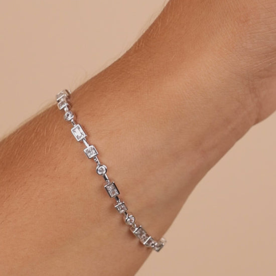 The Camden CZ Staggered Tennis Bracelet does things differently—with a mix of round, square, and baguette-cut Hearts & Arrows CZ stones set in sleek bezel settings. Effortless, unexpected, and made to be worn on repeat.