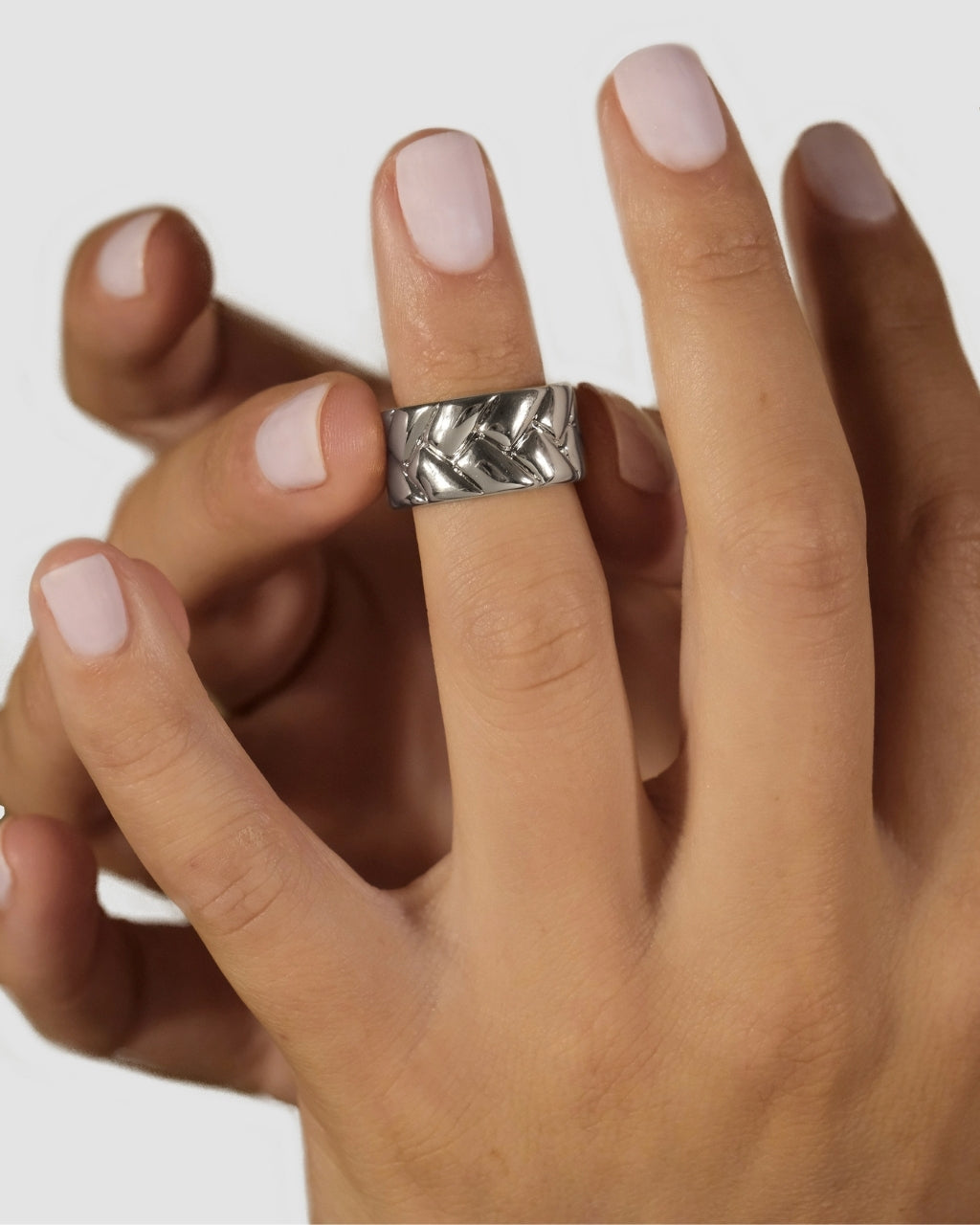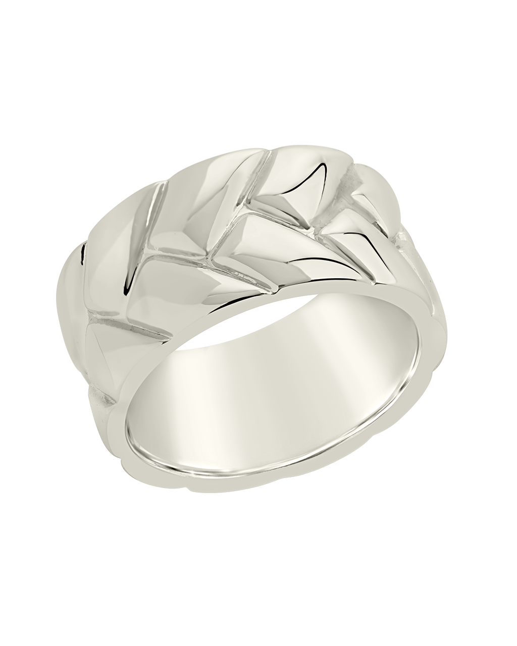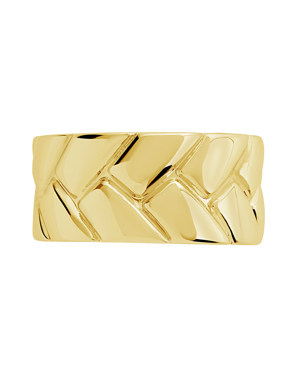 Bold with a touch of texture, this wide gold band features a sleek chevron design for a sculptural finish. An effortless statement piece with just the right edge.