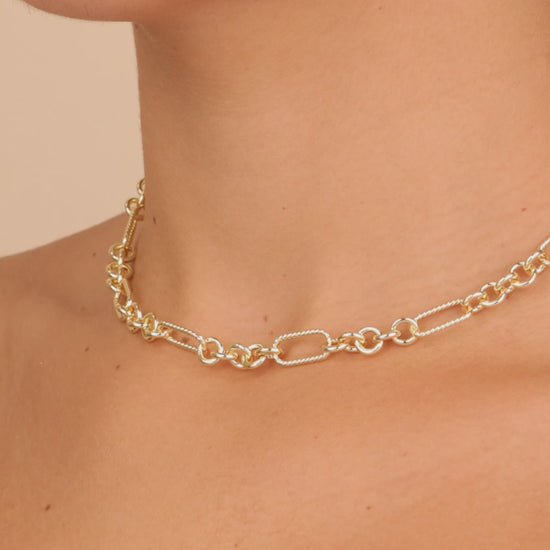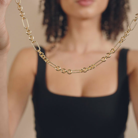 Transform your look into one of timeless elegance with the Fianna Mixed Chain Link Necklace. Crafted with a mix of intricate textured links, this necklace exudes a sense of luxurious sophistication. Elevate any outfit with this versatile piece that effortlessly blends classic and modern elements.