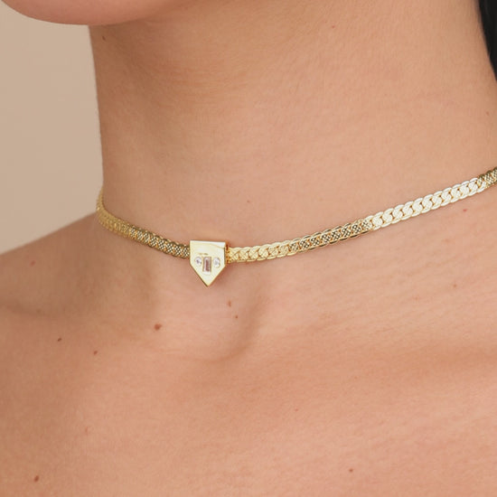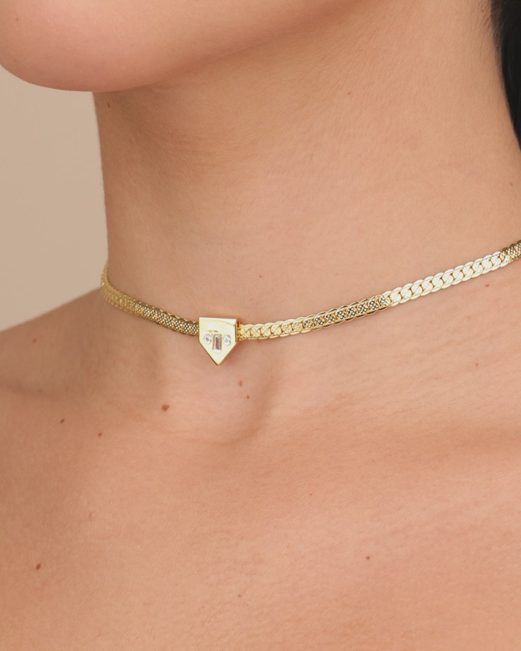 This is no ordinary choker! You'll turn heads when you're wearing this striking chain choker necklace with a pointed center pendant that features shining CZ stones. Available in gold and silver tones.