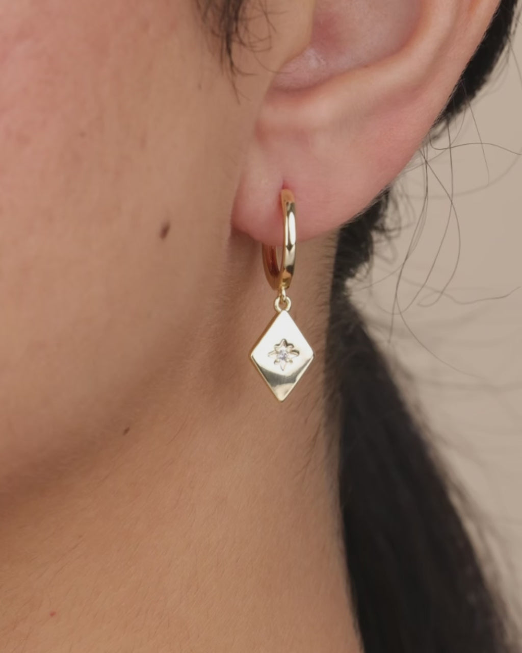 Celestial but understated. These mini drop hoops feature a sleek diamond-shaped charm etched with a radiant starburst and a sparkling CZ center. Perfect for layering or letting them shine solo in your first piercing.