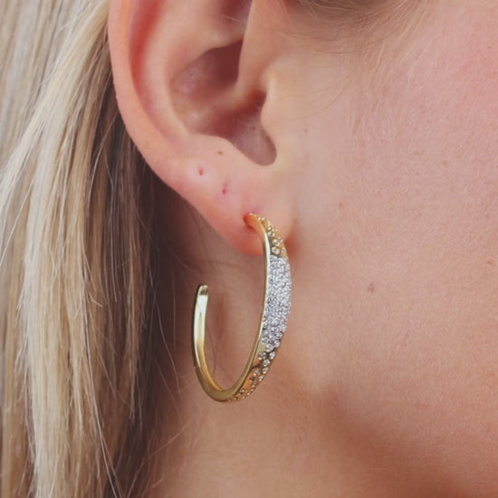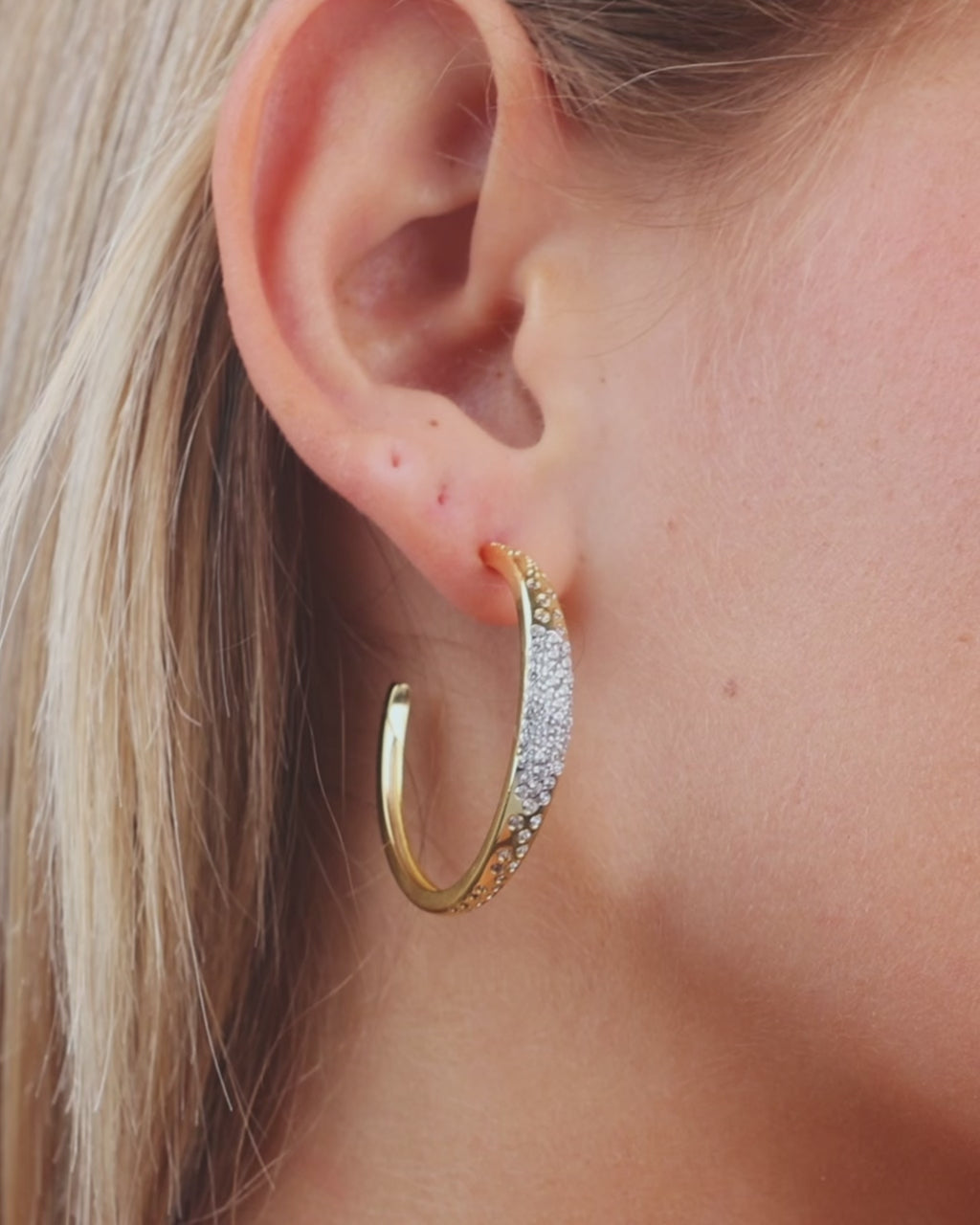 Curve appeal. A bold update to your everyday hoops—sleek arcs meet delicate pavé for just enough drama to take you from AM to after hours.