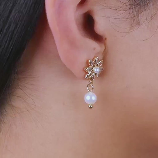 Make your inner royal happy with these regal studs! These earrings feature a pearl and CZ stone flower with pearl dangles. Available in gold and silver tones.