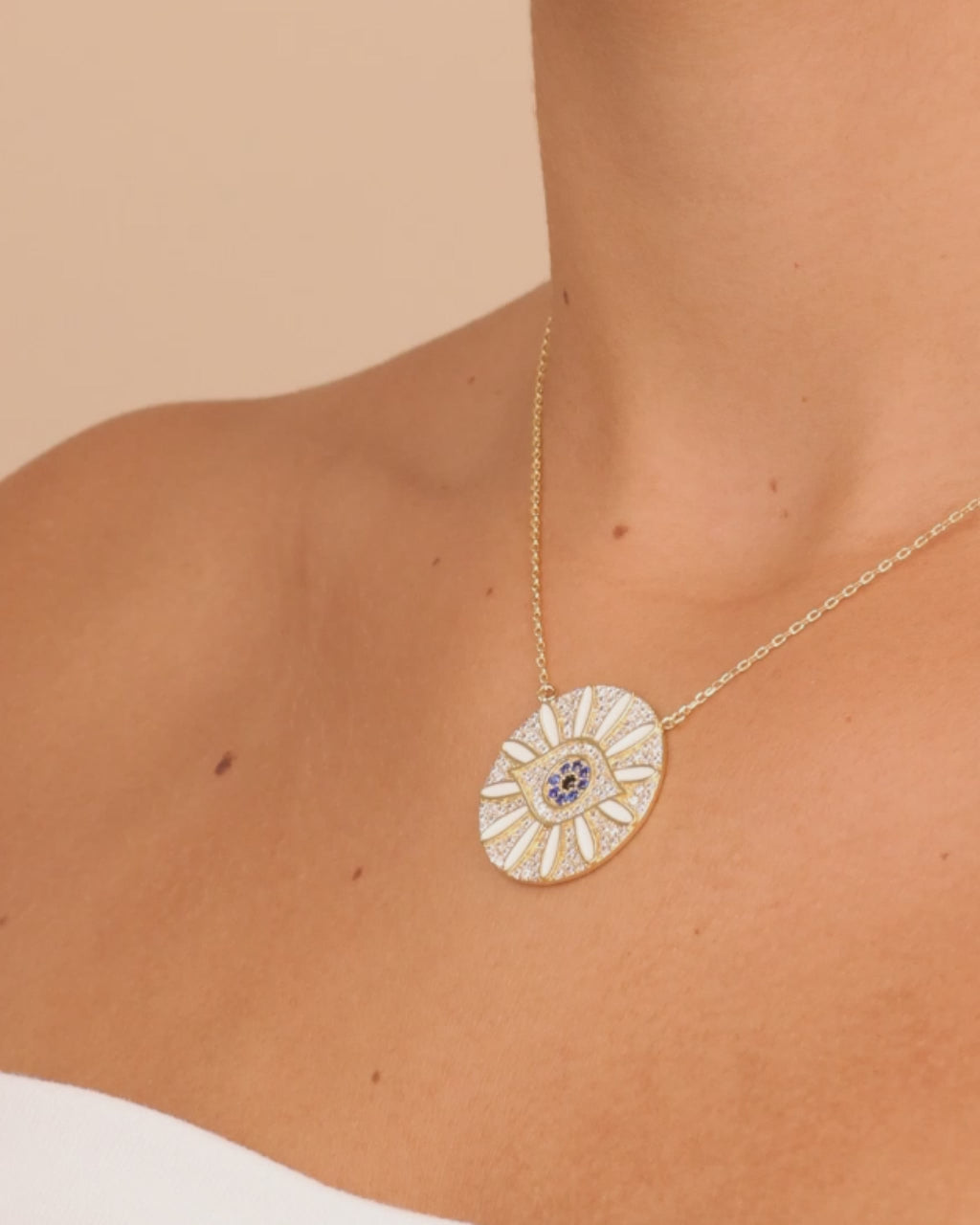Bring on the good vibes! This evil eye petal pendant is perfect for anyone who wants to add some CZ shine to their look of the day. Available in gold and silver tones.