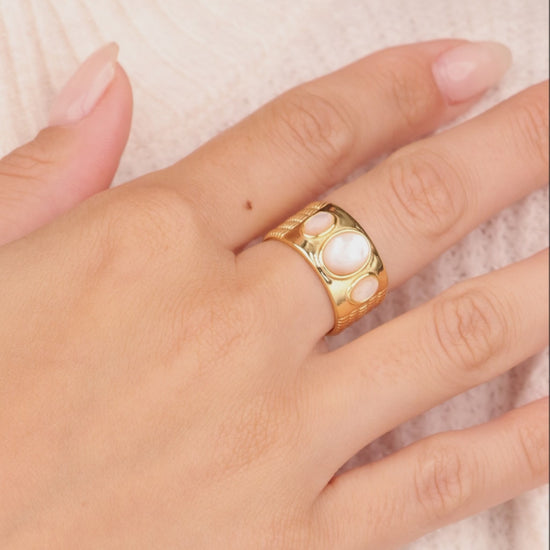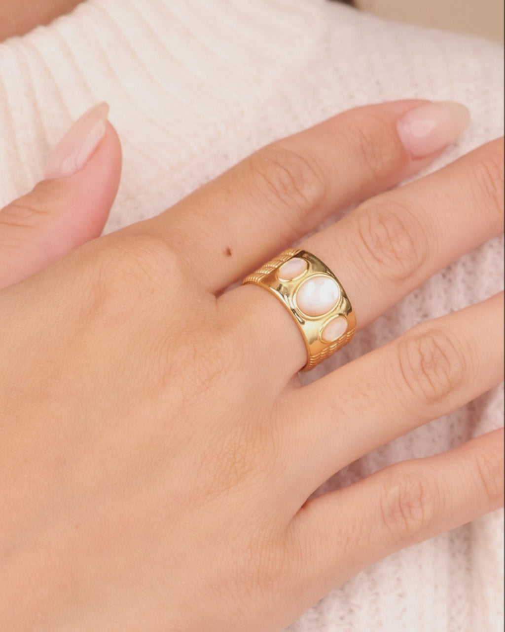 Indulge in the luxurious elegance of the Galina Triple Moonstone Ring. Adorned with a stunning triple moonstone design, including one large stone and two smaller stones, this polished band exudes sophistication. Embrace the beauty and charm of this exclusive piece, fit for any occasion.