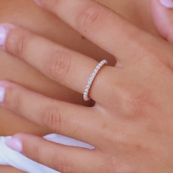 Equal parts sweet and polished. This pearl-studded band wraps your finger in polished detail, with a dainty silhouette made for stacking. Try pairing it with a mixed-metal ring or wear it solo for quiet shine.