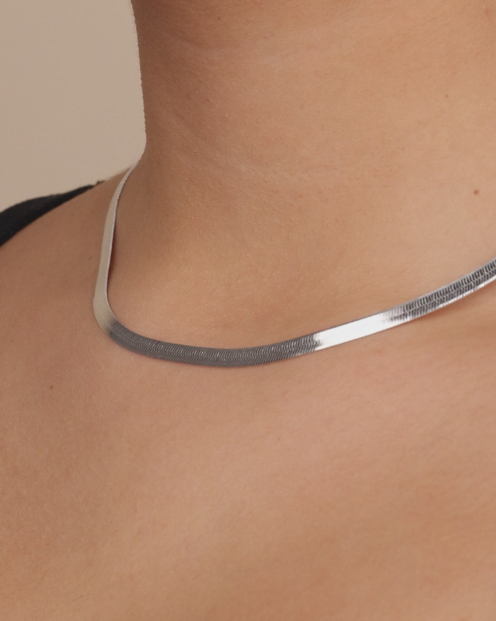 The chain that does it all—quietly. This herringbone lays flat and shines just enough. Clean, smooth, and effortlessly polished. Whether you wear it solo or stack it up, it gives any ensemble that pulled-together look. Available in gold or silver, both undeniably refined to perfection.