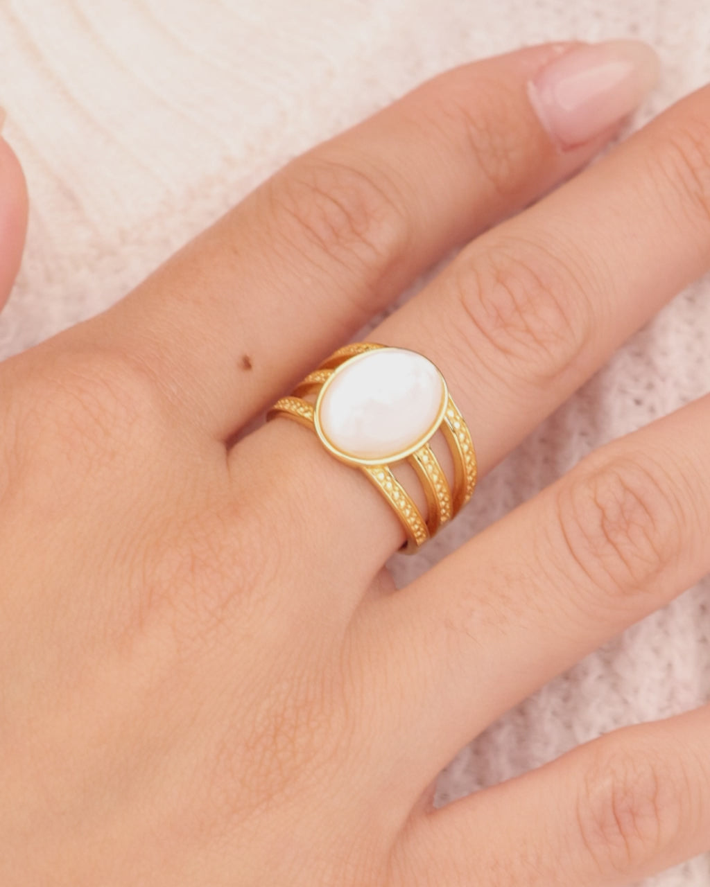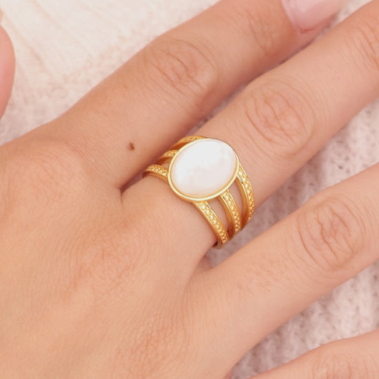 Indulge in luxury with the Illyana Moonstone Triple Row Ring. The big centered moonstone creates a mesmerizing focal point, while the triple row band adds dimension and texture. Elevate your style with this exclusive piece, befitting of art & fashion.