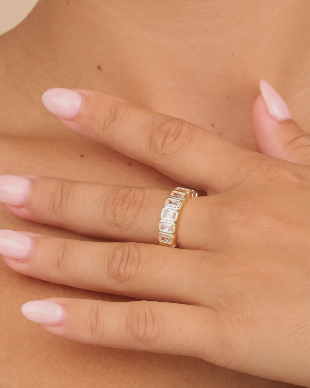 Structured, bold, and totally stackable. This bezel-set band features a row of clean baguette with just the right edge. Wear it solo for impact or mix into your everyday ring rotation.