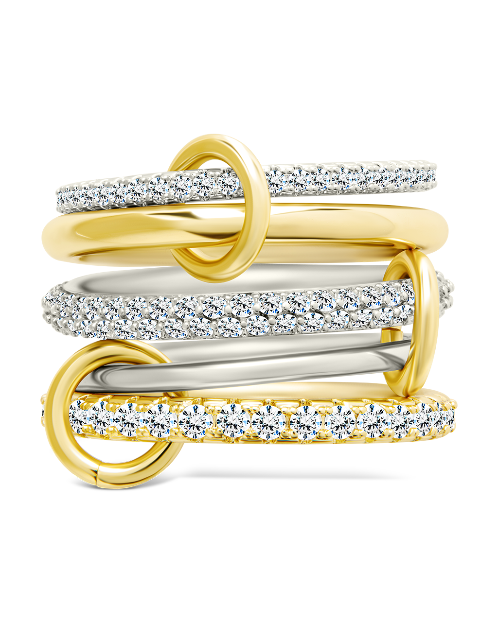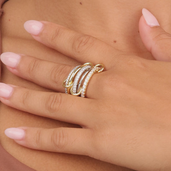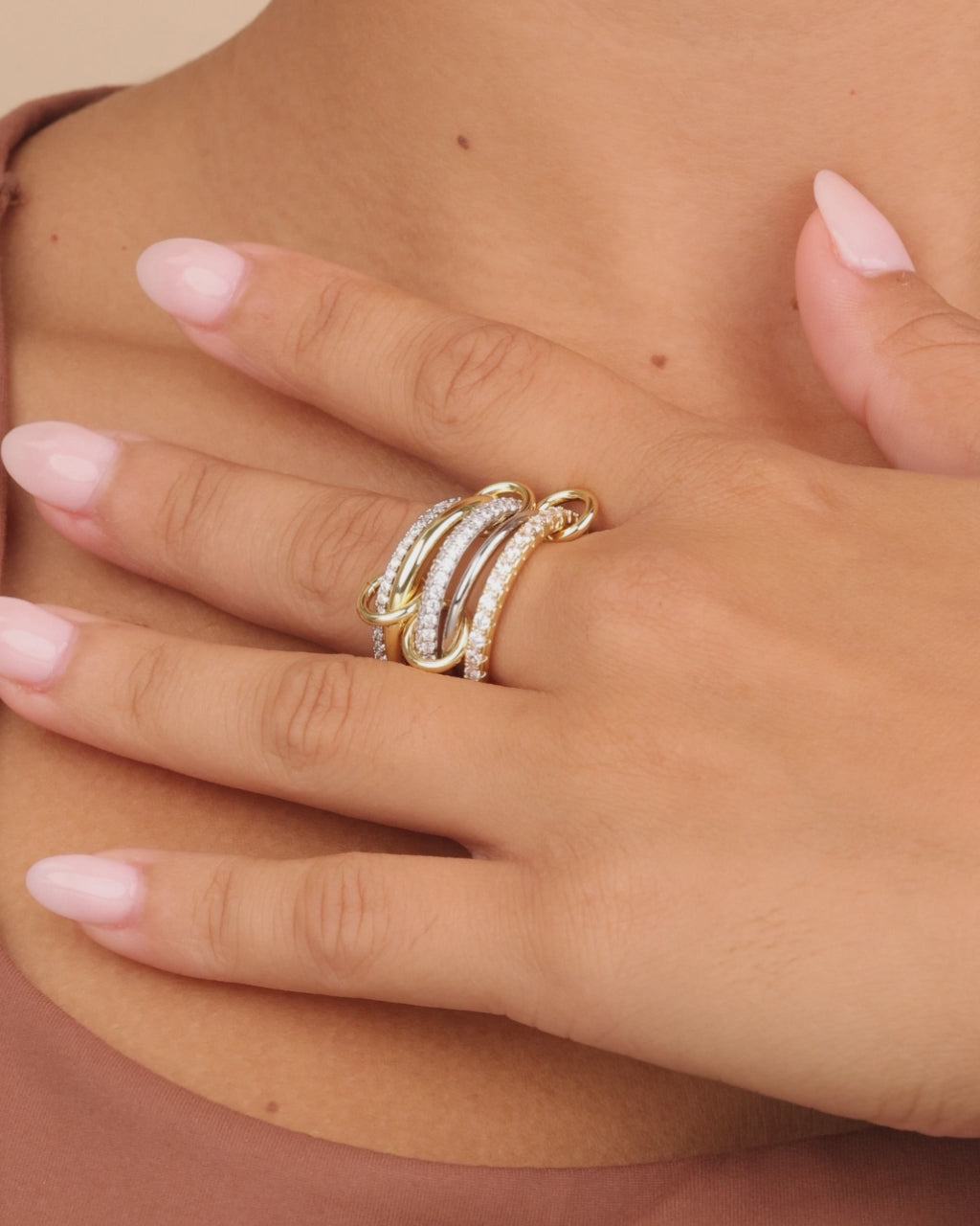 Stacked but never subtle. This bold link ring brings together pavé bands and chunky gold connectors in a layered design that does all the talking—for you.