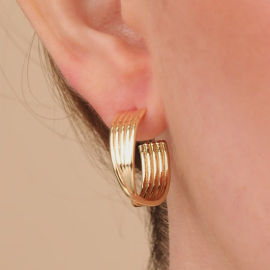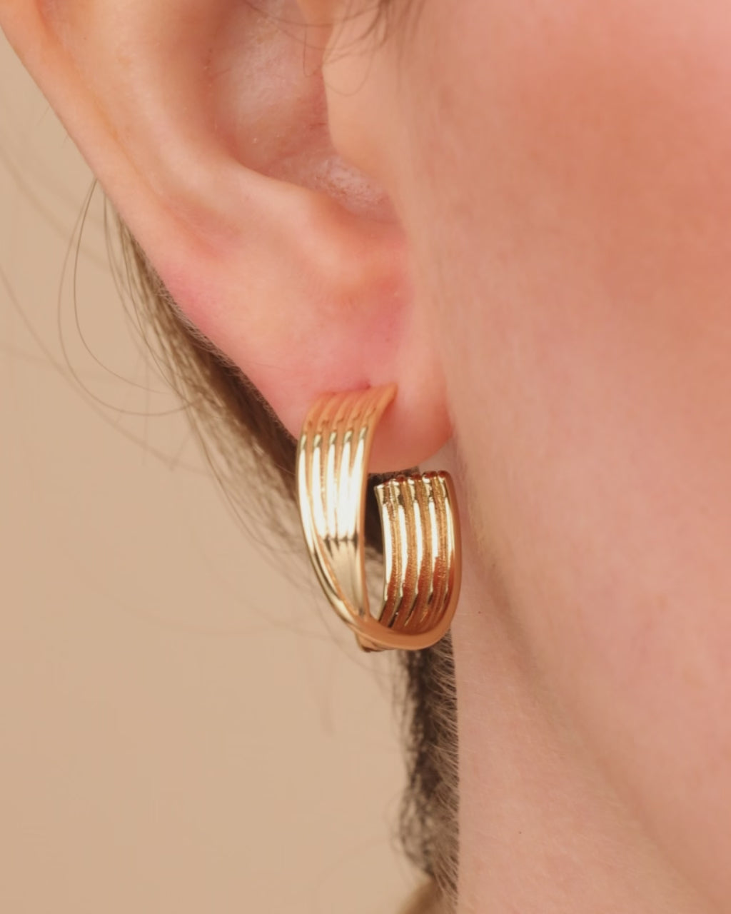 Streamlined with a twist. These multi-ridge hoops bring dimension without the bulk, making them the ideal middle-ground between a bold statement and an everyday staple. Pair them with polished tailoring or a slinky dress for subtle edge.
