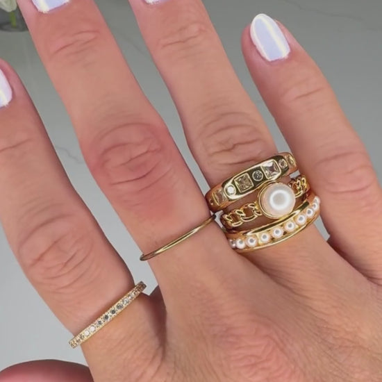 Features: 2mm/2.7mm/3.4mm bands, 0.6" stacked width, 1.5mm & 2.5mm CZ stones, 6.25mm & 2mm pearls, Lead & Nickel free