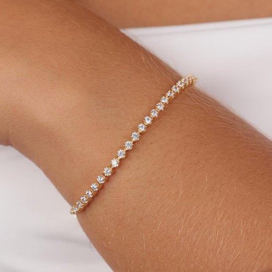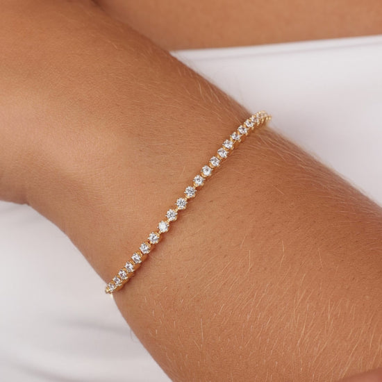The Lavinia Bracelet keeps things simple, but never plain. A continuous row of brilliant-cut hearts and arrows CZ stones sits along a delicate gold-plated chain, catching light with every flick of the wrist.