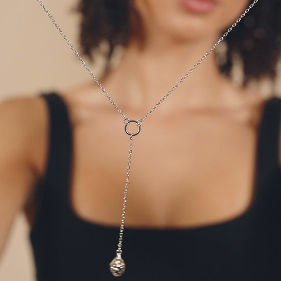 This glam lariat necklace is sure to be the perfect finishing touch to any outfit! Available in silver and gold tones, this necklace features a bold textured charm at the end of a dainty chain. Adjustable for a perfect fit.