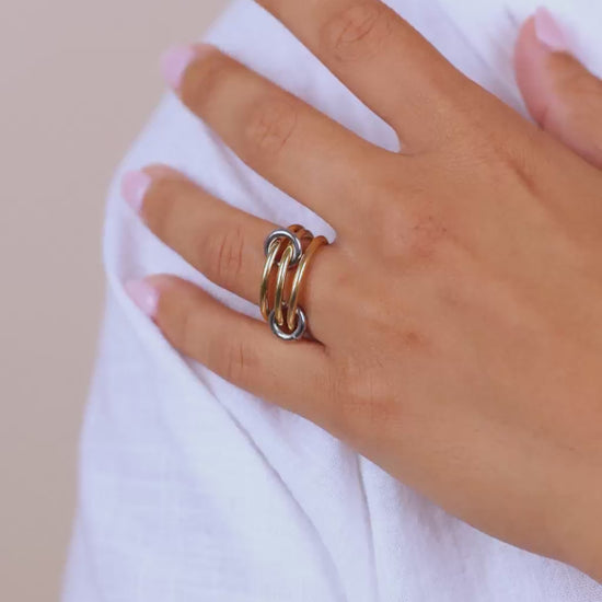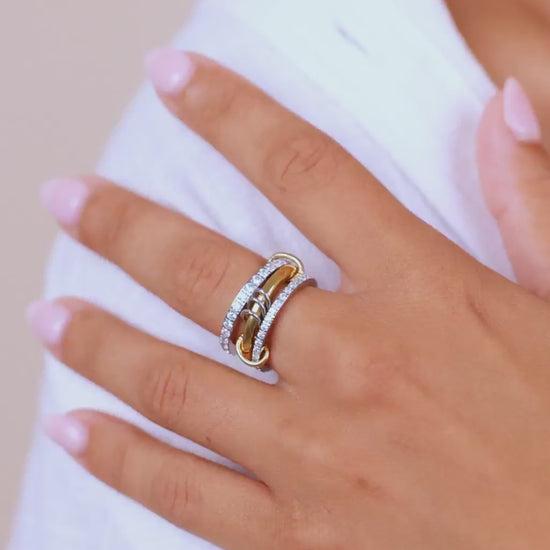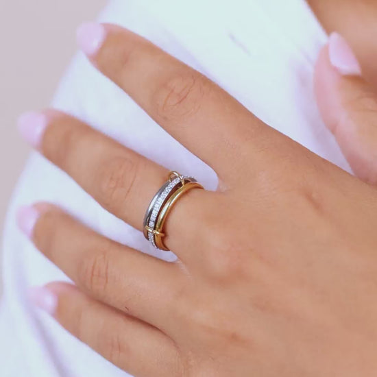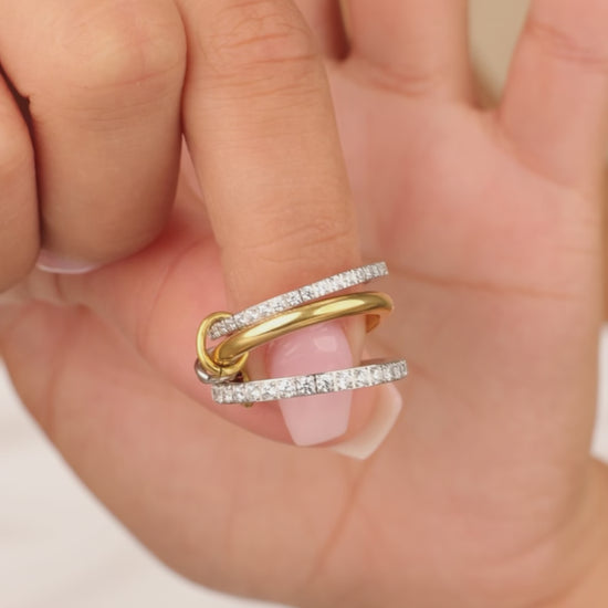 Designed with a striking mix of pavé-set crystals, polished gold tones, and interlocking silver accents, this 3-ring set is linked by two rotating connectors to keep the rings interlocked. This designer-inspired ring set is the latest trend-setting, mixed-metal moment going viral from runways to TikTok.