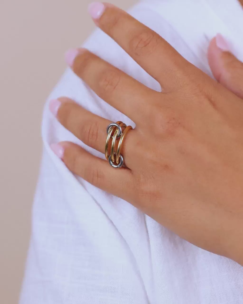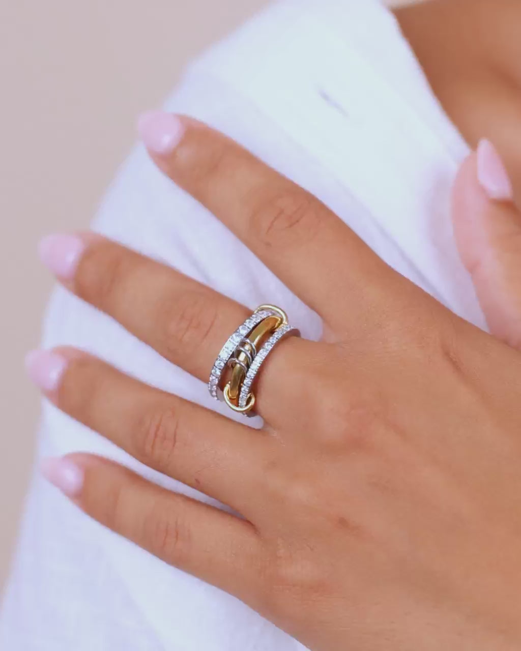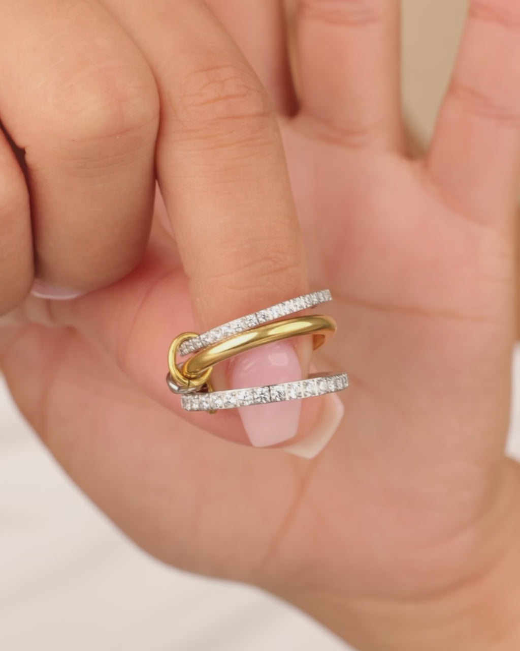 Designed with a striking mix of pavé-set crystals, polished gold tones, and interlocking silver accents, this 3-ring set is linked by two rotating connectors to keep the rings interlocked. This designer-inspired ring set is the latest trend-setting, mixed-metal moment going viral from runways to TikTok.