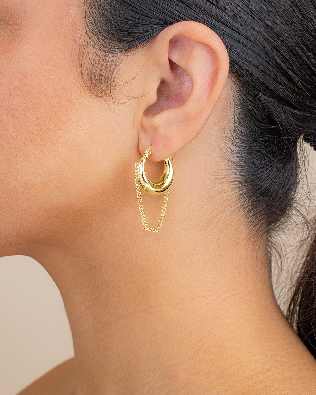 Sculptural hoops with a twist. These bold, high-shine earrings are finished with a draped chain detail that moves with you. Wear them when your outfit needs something a little unexpected.