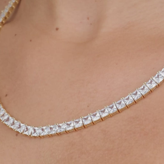 The boldest link in your layering game. This squared tennis necklace delivers max shine with every angle—no spotlight needed.
