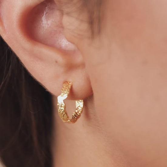 Organic texture, sculptural silhouette. These molten-inspired hoops are bold in detail but small in scale—perfect for stacking with polished studs or pairing with a crisp white tee.