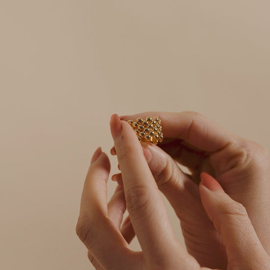 Indulge in luxury with our Melanie Bubble Ring. This elegant and polished ring features a unique bubble design that adds a touch of sophistication to any outfit. Crafted with high-quality materials, it exudes exclusivity and charm. Elevate your style with this exquisite piece.