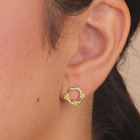 You'll feel like the queen bee when you're wearing this geometric open stud! Each one is adorned with a pair of flowers and a dainty bee. Add the silver or gold tone version to your jewelry box -- they're both worth buzzing about!