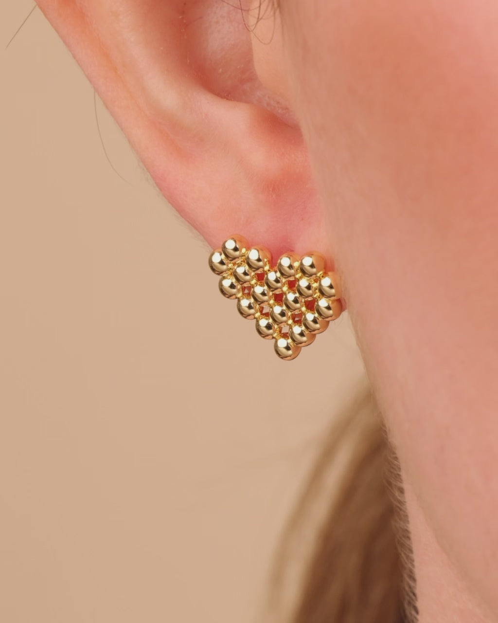 A sweet-but-bold take on the classic stud. These dimensional heart earrings feature a beaded texture that adds just enough drama to your everyday lineup. Style solo for a playful pop or pair with sleek gold huggies to keep it balanced.
