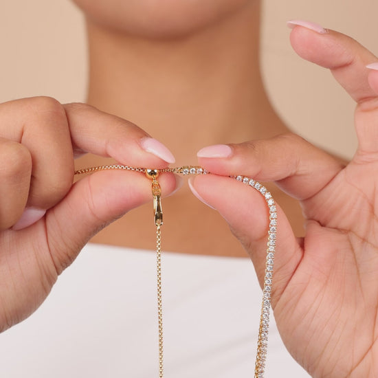 The Mirabell Tennis Bolo Necklace is your not-so-basic classic. With round Hearts & Arrows CZ stones and an adjustable bolo chain, it’s equal parts polished and playful. Wear it loose, wear it high—it’s made to move with you.