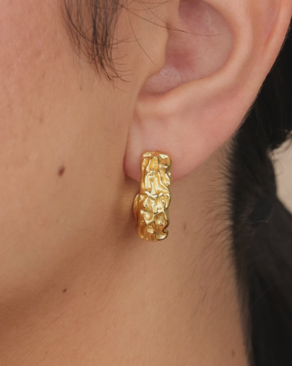 Bold, sculptural, and totally trend-proof. These silver hoops bring a textured finish that feels equal parts organic and elevated. Stack them with sleek studs or wear them solo for a confident finish.