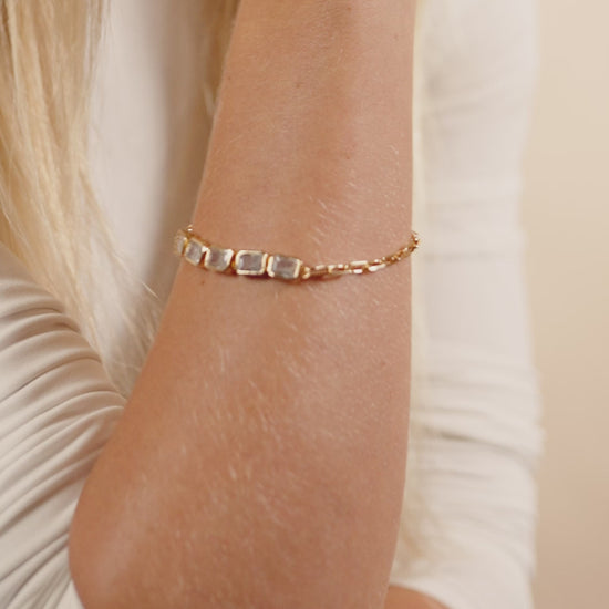 Indulge in luxury with our Nyssa Bezel CZ Station Bracelet. This delicate chain bracelet features a row of beautiful square cz, adding a touch of sophistication and elegance to any outfit. Perfectly stationed for a refined look, this bracelet is a must-have for the fashion-forward individual.