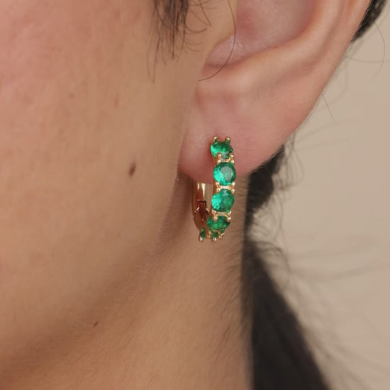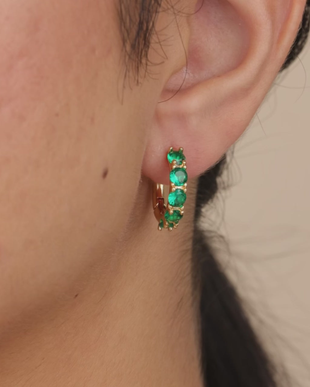 Not your basic huggie. This pair features a row of rich green stones in a bold gold setting that feels fresh but still wearable. An easy way to add color without going full statement.