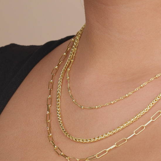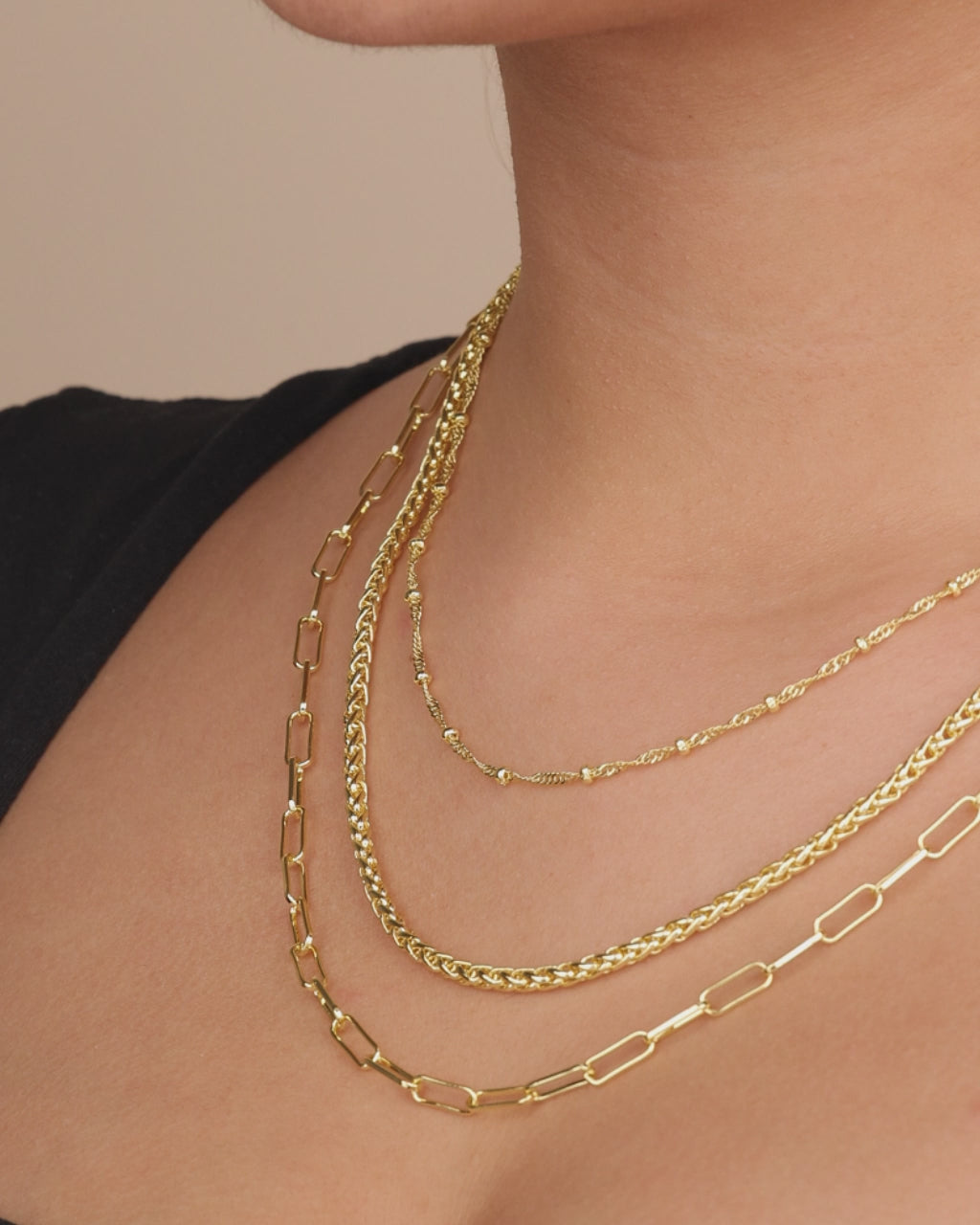 Love mixed materials and layered pieces? This necklace is the one for you! You'll love showing off the three unique chains that make up this elegant, versatile necklace. Available in gold and silver tones. Adjustable for a perfect fit.
