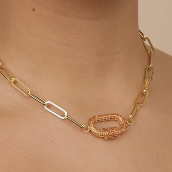 Stand out from the crowd with this striking, bold accessory! This wide-link necklace features a dazzling CZ-studded carabiner. Available in gold and silver tones and with clear, blue, green, and red stones.