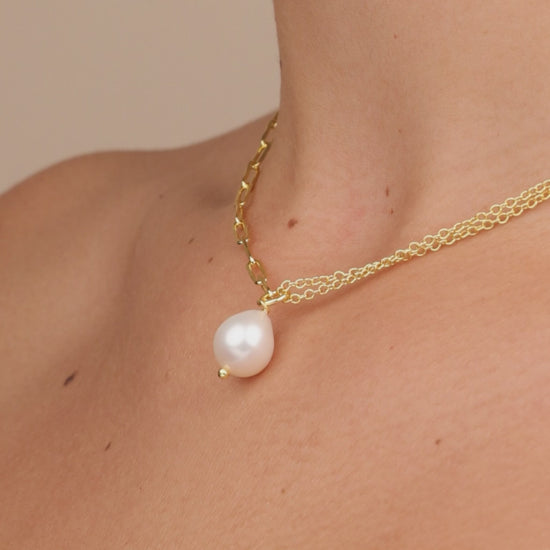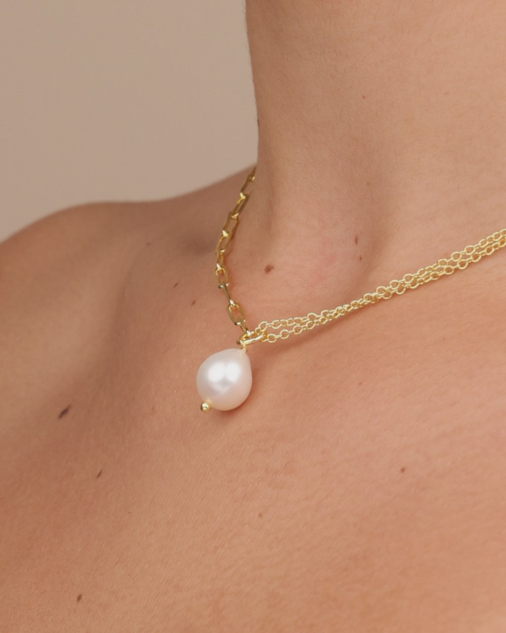Two textures, one standout piece. This asymmetrical chain necklace features a single freshwater pearl drop and a mix of classic and paperclip links. Easy to style, impossible to overlook.