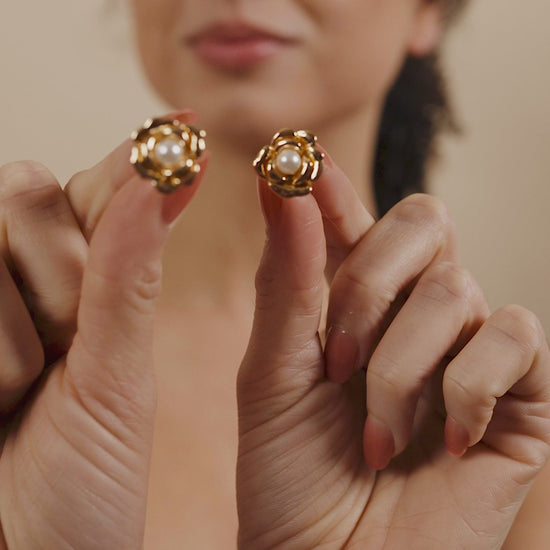 Indulge in the allure of our Rosa Pearl Flower Stud Earrings. Each rose-shaped stud is elegantly adorned with a centered pearl, adding a touch of sophistication to any outfit. Exude luxury and exclusivity with these timeless earrings.