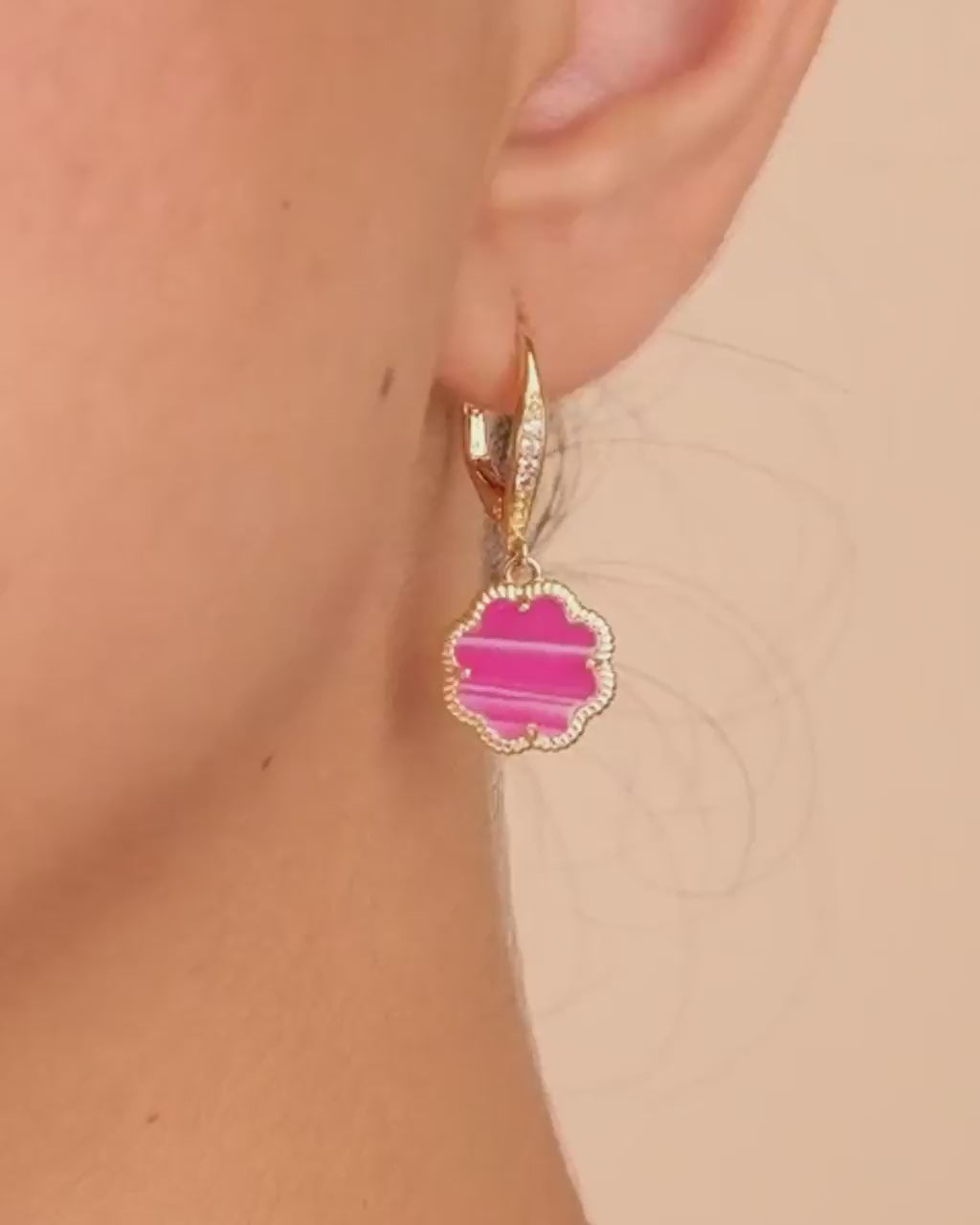 Floral fans will adore these rose petal drop earrings! Add a touch of garden glam to any look with this CZ-studded pair that features mother of pearl, malachite, tigers eye, or onyx stones. Available in gold and silver tones.