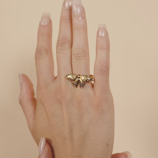 Indulge in the beauty of nature with the Rowena Ring. This exquisite piece features a delicate butterfly design, making a statement on your finger. Let this luxurious ring bring a touch of elegance to your wardrobe.