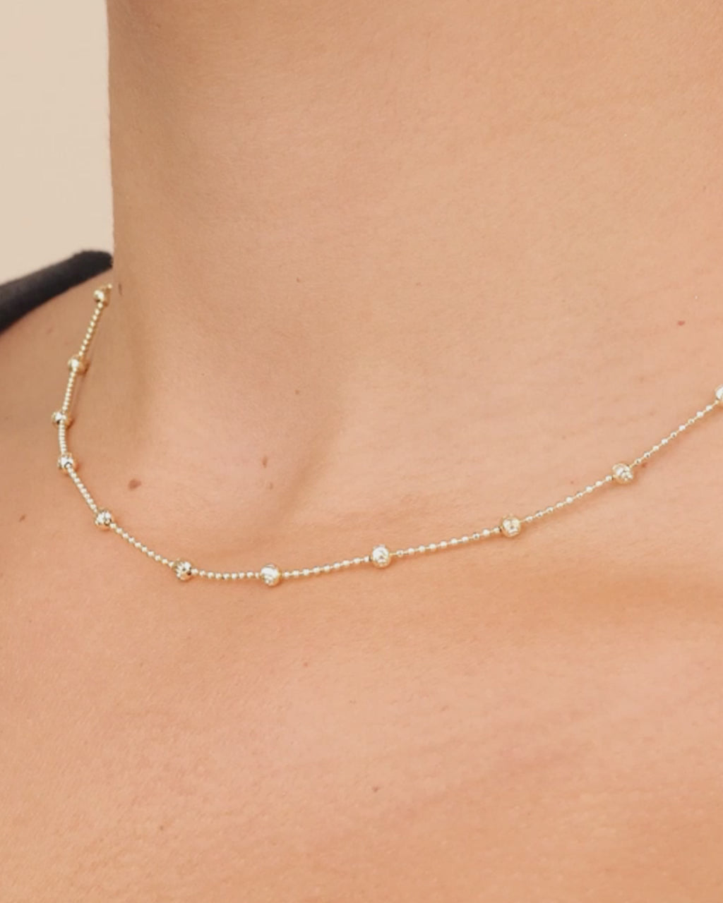 Elevate your look with our Rumor Stationed CZ Necklace. The dual-tone design features a string of silver stationed beads, adding a touch of luxury to any outfit. Exude sophistication and exclusivity with this beaded station necklace.