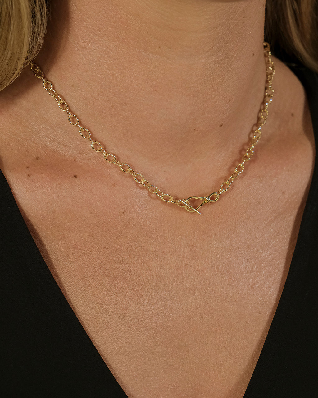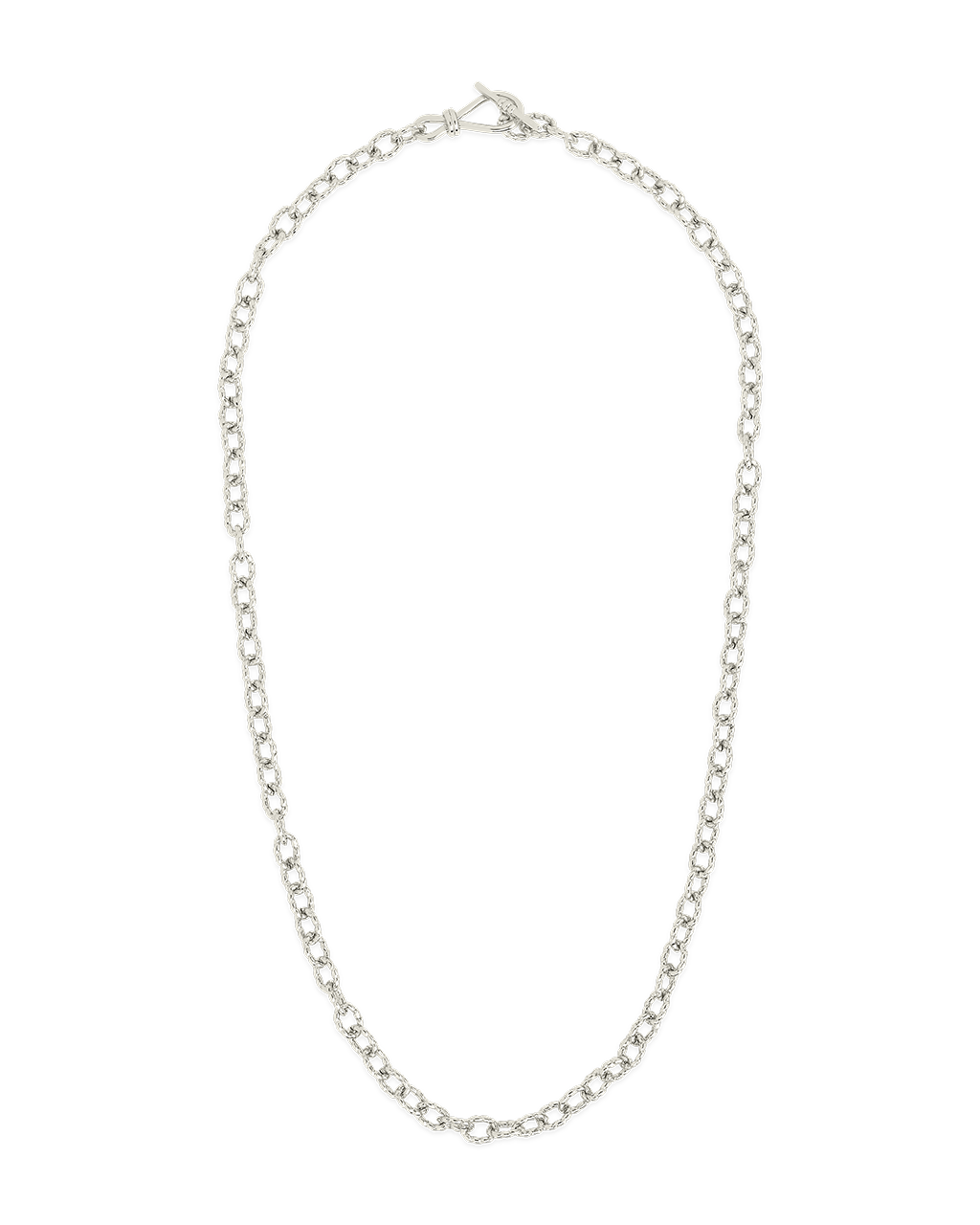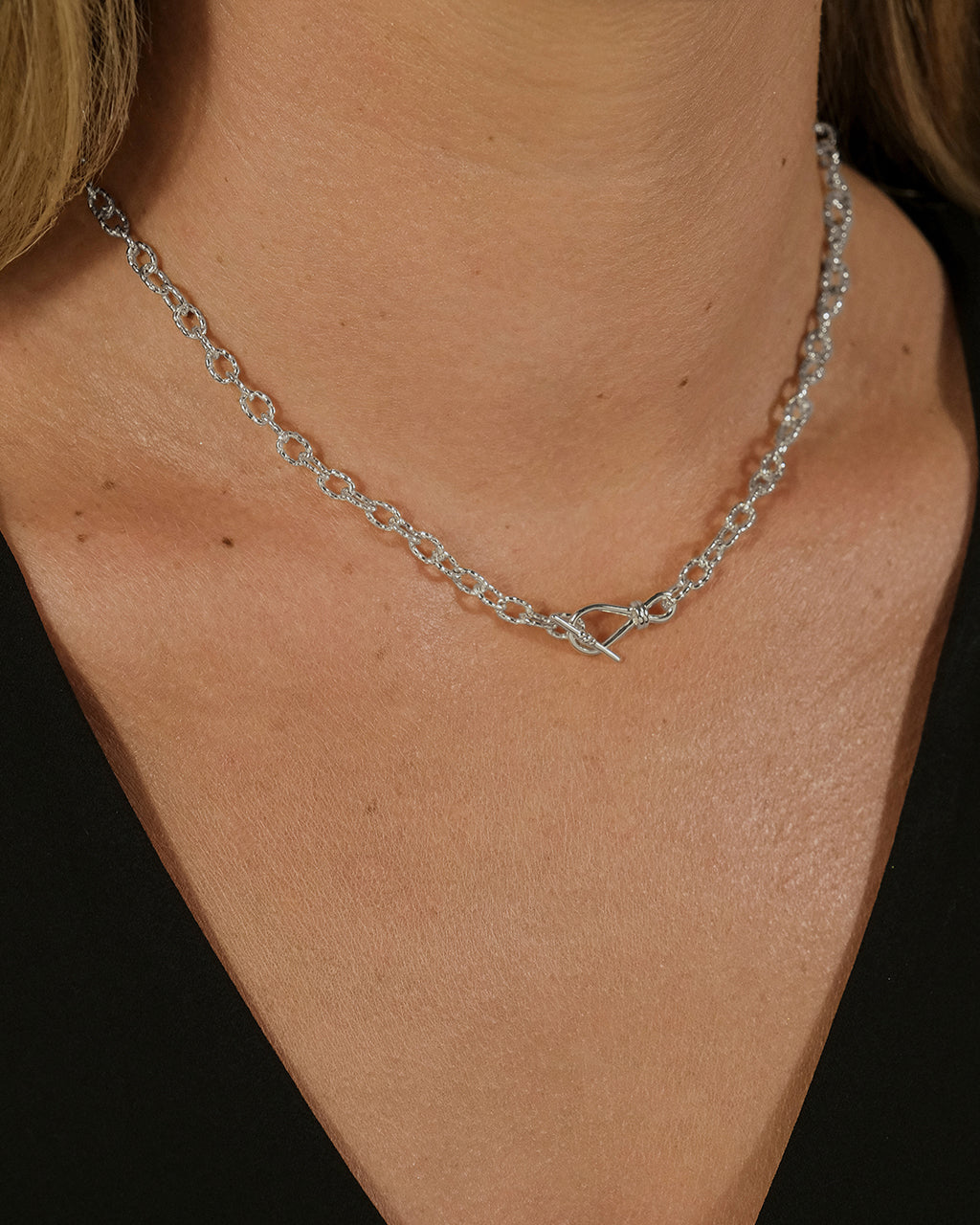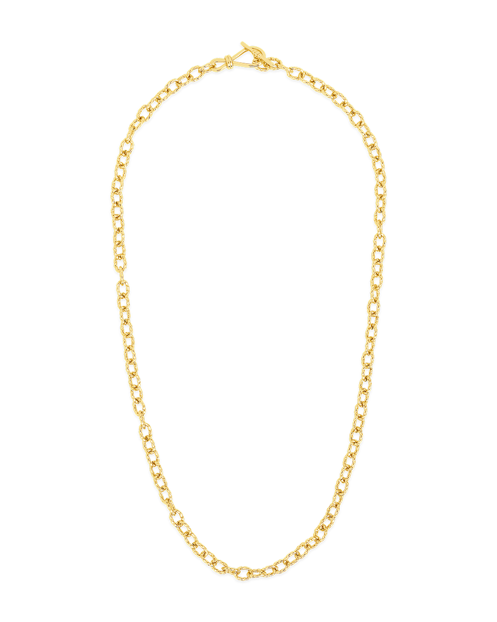A refined chain meets a sculptural toggle in this polished statement piece. The twisted links and front clasp give it a bold-meets-minimalist vibe—ideal for solo wear or layered with your everyday favorites.