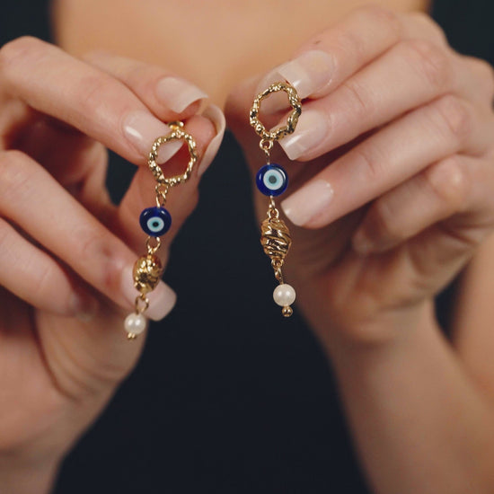 Indulge in the luxurious and exclusive Sibyl Pearl & Evil Eye Drop Stud Earrings. These drop earrings feature stunning pearls and captivating blue glass beads, adding an elegant touch to your look. With the eye-catching addition of the evil eye, these beachy earrings exude sophistication and style. Elevate your wardrobe with these must-have statement pieces.