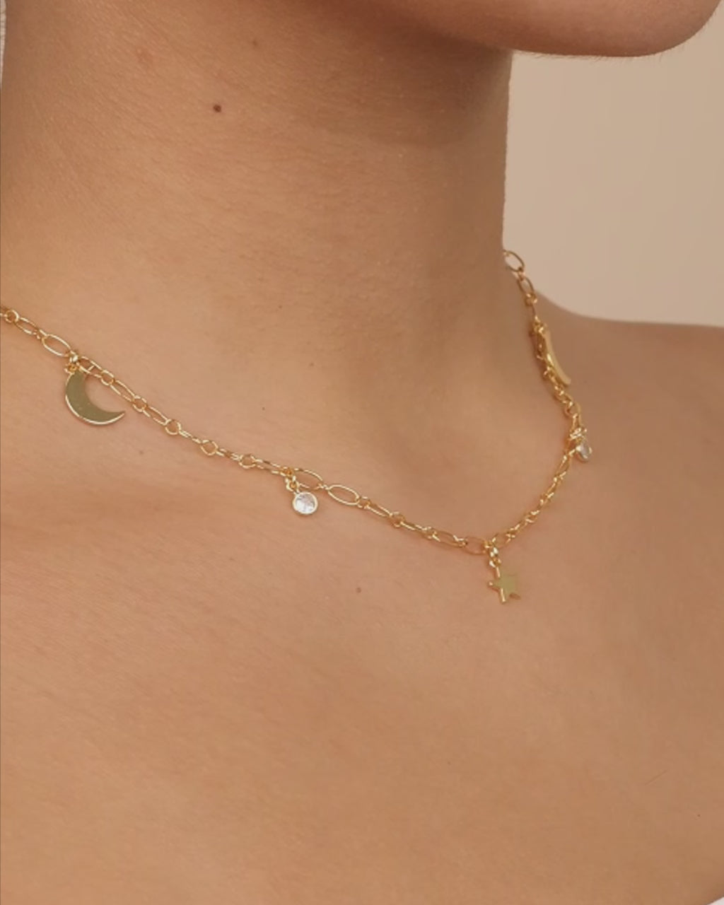 Bring the beauty of the night sky everywhere you go by wearing this sparkling CZ, star, and moon chain necklace! This elegant chain is studded with charms in the shapes of celestial bodies. Available in gold and silver tones.