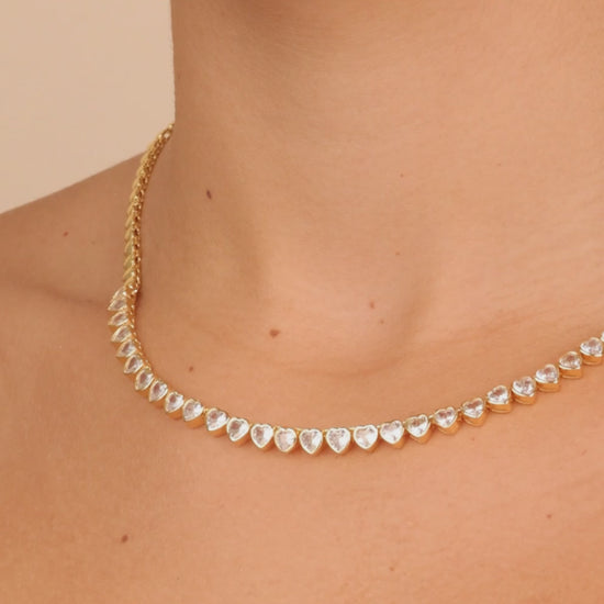 This exquisite tennis necklace exudes timeless sophistication with its stunning heart-shaped CZ diamonds. Handcrafted with meticulous attention to detail, it is a versatile piece that adds a touch of elegance to any outfit. Elevate your style with this luxurious necklace and make a statement of grace and beauty.