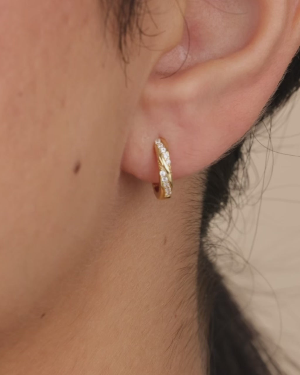 A sculpted swirl of shimmer. These micro hoops feature a diagonal CZ-lined curve for a polished twist on a classic shape—understated, but never boring.