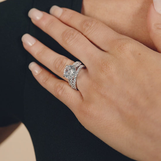 If your lady loves bold, sparkling pieces, she'll fall in love with this brilliant engagement ring set! It features three pieces -- two CZ-studded bands and a center ring with a bold and bright CZ stone.